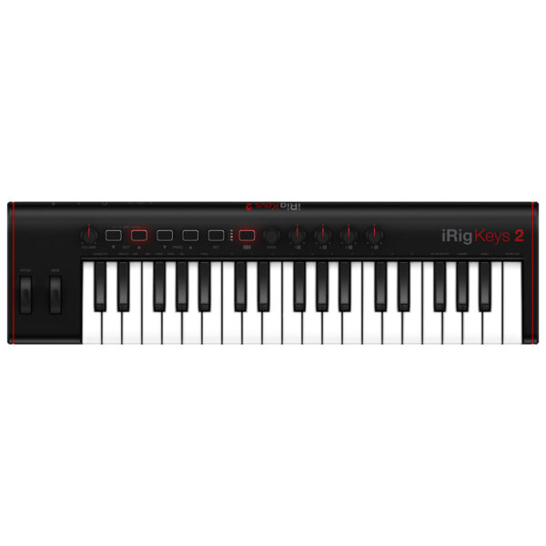Controlador MIDI iRig Keys 2 de IK MULTIMEDIA. Compacto de 37 teclas para iPhone / iPad y Mac / PC. Con compatibilidad mejorada para los dispositivos móviles más recientes, entrada y salida MIDI completas, múltiples opciones de energía, un paquete de software incluido y un nuevo aspecto elegante.