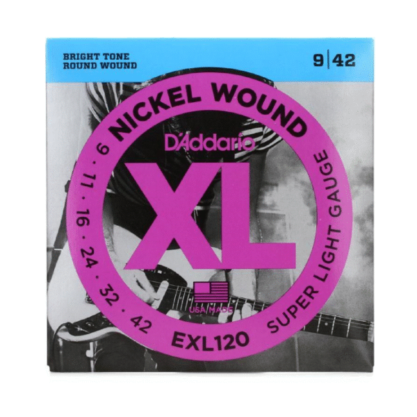 Juego de cuerdas para guitarra eléctrica D´Addario EXL120 Super Light (9-42). Muy comodas y con un sonido muy rico, de los modelos mas vendidos.