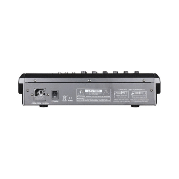 Mixer 6 Entradas XLR o línea TRS. Salida master por XLR y TRS. Salida rec por RCA. Módulo reproductor mp3 con entrada usb y bluetooth. Canal independiente para control MP3. Ecualizador de 3 bandas por canal. Módulo de efectos con 16 presets (96kHZ/24bits). Salida Auxiliar.