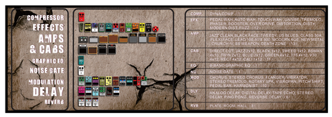 Amp / Cabinets : 13 de amplificadores y gabinetes seleccionados, incluidas simulaciones de válvulas clásicas y de estado sólido. Desarrollado por la tecnología NUX TS / AC.