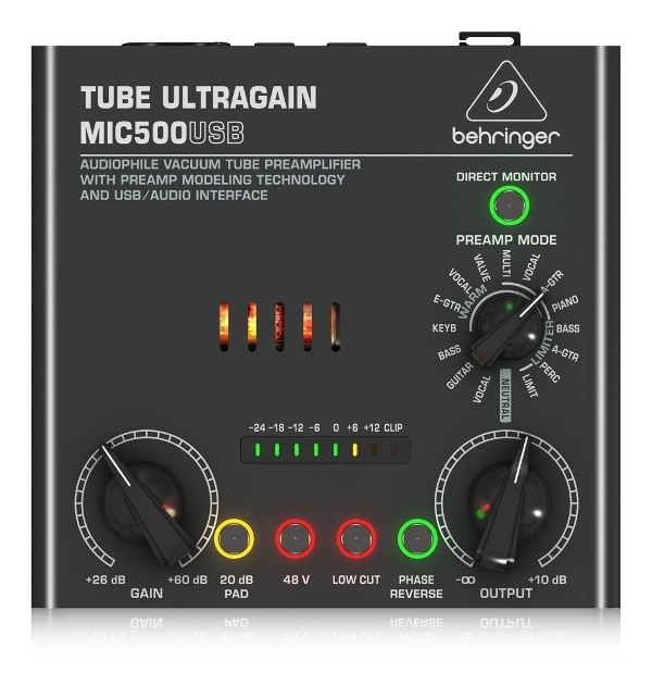 El tubo preamplificador Ultragain Behringer MIC500USB es un preamplificador de calidad ideal para micrófonos tanto como instrumentos. Con un modelado de preamplificación flexible además de 16 voicings de preamplificador, este dispositivo, el MIC500USB permite a los usuarios optimizar sus grabaciones con una variedad de ajustes de calidad. Una interfaz de audio USB integrada permite a los usuarios conectar el preamplificador directamente a su ordenador para una perfecta grabación y para posteriores mezclas. El tubo de vacío 12AX7 especial ofrece sonidos realmente cálidos y el filtro de corte bajo elimina ruidos no deseados para un rendimiento acústico puro. Un LED de 8 segmentos garantiza la supervisión simple y el previo Ultragain también proporciona a los usuarios de alimentación phantom, un interruptor de inversión de fase y un pad de 20 dB .