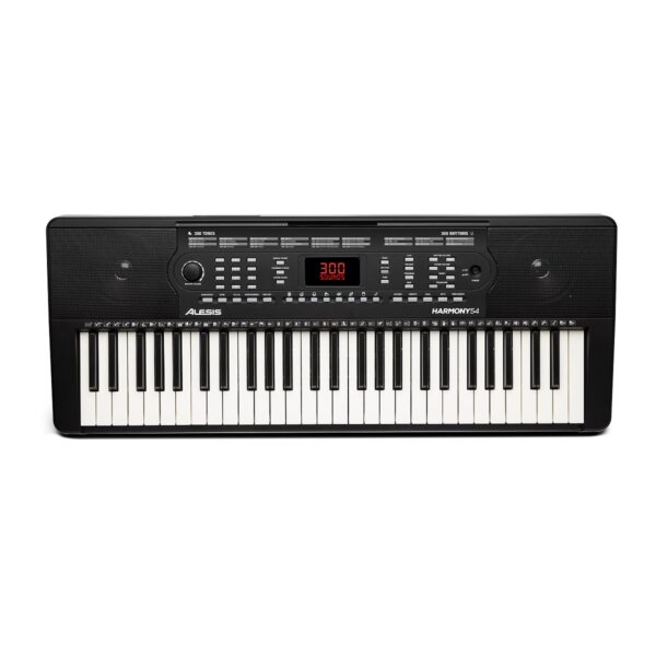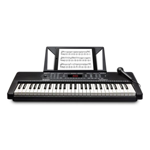 Teclado Alesis de 54 teclas estilo piano con parlantes incorporados, 300 sonidos, 300 ritmos incorporados, 40 canciones de demostración, Canta junto con el micrófono incluido. El conector para audfonos de 1/8 ”silencia los altavoces para la práctica privada. El atril de descanso sujeto al teclado es compatible con su partitura o tableta, Incluye adaptador de corriente o alimentación con 6 pilas AA (no incluidas).